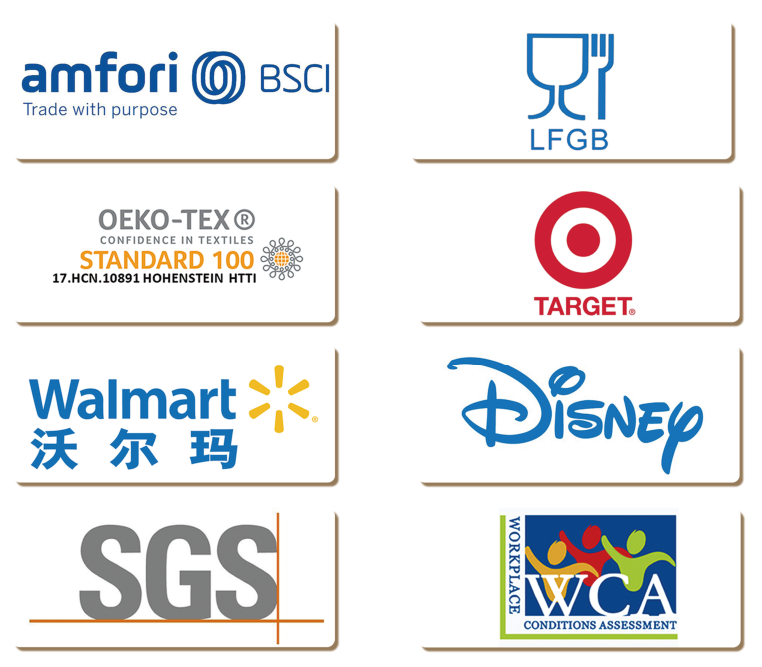 公司視產(chǎn)品質(zhì)量如生命,始終堅(jiān)持“以創(chuàng)新誠(chéng)信求生存,以品種質(zhì)量謀發(fā)展”的質(zhì)量方針。公司先后通過(guò)ISO9001:2015質(zhì)量管理體系認(rèn)證、ISO14001:2015環(huán)境管理體系認(rèn)證和知識(shí)產(chǎn)權(quán)管理認(rèn)證;通過(guò)美國(guó)沃爾瑪驗(yàn)廠、迪士尼驗(yàn)廠、塔吉特驗(yàn)廠及歐盟BSCI認(rèn)證;產(chǎn)品通過(guò)歐洲Oeko-Tex standard 100生態(tài)紡織品1類(嬰幼兒)產(chǎn)品認(rèn)證、WCA、SQP認(rèn)證;產(chǎn)品通過(guò)SGS檢測(cè)及BV檢測(cè),未發(fā)現(xiàn)增塑劑、雙酚A、福爾馬林等有害物質(zhì);有害重金屬及有害物質(zhì)符合歐盟EN 71玩具安全標(biāo)準(zhǔn),符合美國(guó)ASTM F963玩具標(biāo)準(zhǔn);產(chǎn)品材料符合德國(guó)LFGB食品接觸材料管理法、歐盟Reach法規(guī)、ROHS指令的相關(guān)環(huán)保標(biāo)準(zhǔn);抗靜電性能符合歐盟EN 1149抗靜電檢測(cè)標(biāo)準(zhǔn)。